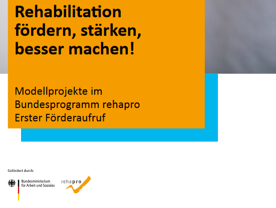 Die Broschüre "Rehabilitation fördern, stärken, besser machen!" stellt alle Projekte vor, die im Rahmen des ersten Förderaufrufs des Bundesprogramms rehapro durch das Bundesministerium für Arbeit und Soziales (BMAS) gefördert werden. Im aktuellen Heft sind 55 Modellprojekte beschrieben, die von persönlichen Gesundheitslotsen über Leistungen in Reha-Häusern bis zur Unterstützung kleiner Unternehmen beim Betrieblichen Eingliederungsmanagement (BEM) reichen. Durch das Erproben innovativer Konzepte sollen neue Wege gefunden werden, die Erwerbsfähigkeit dieser Menschen zu verbessern oder zu erhalten.
