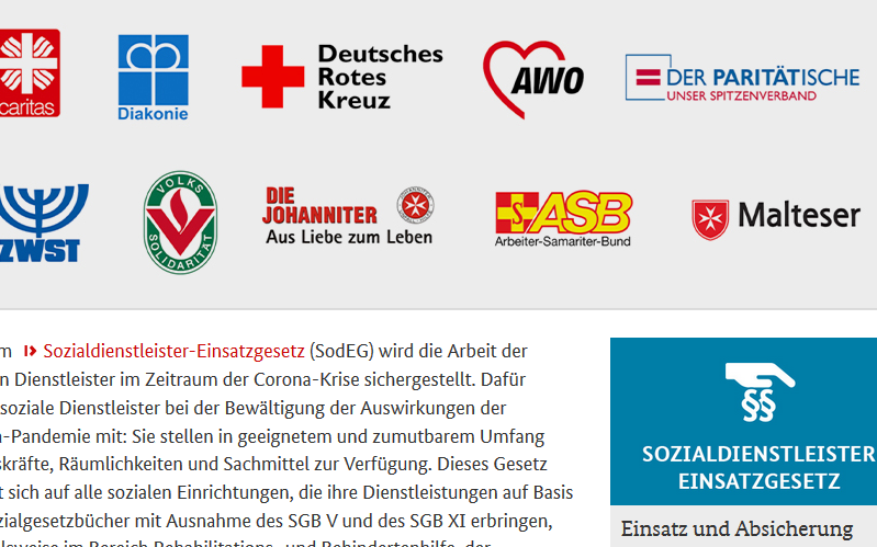 Mit dem Sozialdienstleister-Einsatzgesetz (SodEG) wird die Arbeit der sozialen Dienstleister im Zeitraum der Corona-Krise sichergestellt. Soziale Dienstleister erhalten mit dem SodEG finanzielle Zuschüsse, wenn sie ihre Arbeit aufgrund der aktuellen Situation vor Ort nicht erbringen können. Dafür helfen soziale Dienstleister bei der Bewältigung der Auswirkungen der Corona-Pandemie mit: Sie stellen in geeignetem und zumutbarem Umfang Arbeitskräfte, Räumlichkeiten und Sachmittel zur Verfügung. Dieses Gesetz bezieht sich auf alle sozialen Einrichtungen, die ihre Dienstleistungen auf Basis der Sozialgesetzbücher mit Ausnahme des SGB V und des SGB XI erbringen, beispielsweise im Bereich Rehabilitations- und Behindertenhilfe, der Arbeitsmarktpolitik sowie die Frühförderstellen.