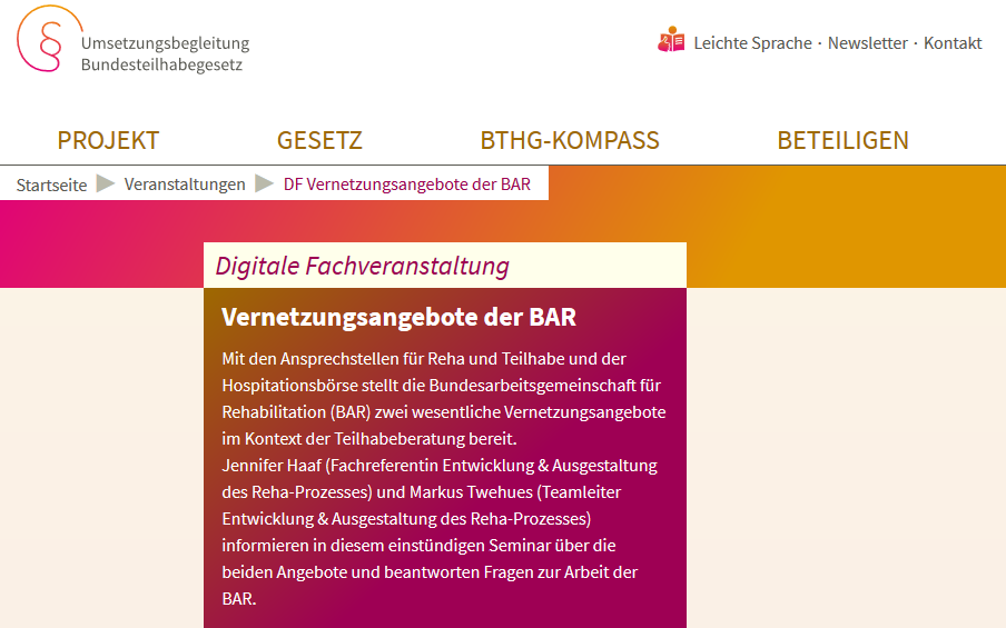 Der Deutsche Verein für öffentliche und private Fürsorge e.V. bietet am 10. Dezember 2020, 11:00 bis 12:00 Uhr, eine Fachveranstaltung zur Vernetzung in der Reha-Praxis an. Mit den Ansprechstellen für Reha und Teilhabe und der Hospitationsbörse stellt die Bundesarbeitsgemeinschaft für Rehabilitation (BAR) zwei wesentliche Vernetzungsangebote im Kontext der Teilhabeberatung bereit. Jennifer Haaf (Fachreferentin Entwicklung & Ausgestaltung des Reha-Prozesses) und Markus Twehues (Teamleiter Entwicklung & Ausgestaltung des Reha-Prozesses) informieren in diesem einstündigen Online-Seminar über die beiden Angebote und beantworten Fragen zur Arbeit der BAR.