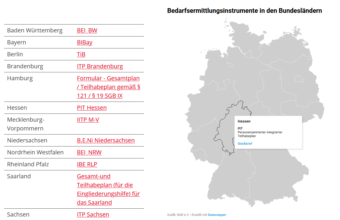 Auf der Website der BAR werden die Bedarfsermittlungsinstrumente (BE-Instrumente) der Eingliederungshilfe in den verschiedenen Bundesländern überblicksartig dargestellt. Die Instrumente werden mit gesetzlichen Vorgaben und untergesetzlichen Anforderungen an Bedarfsermittlungsinstrumente abgeglichen. Dabei handelt es sich um formale, prozessuale und inhaltliche Anforderungen, die die Gestaltung des Instruments, die Durchführung der Bedarfsermittlung mit dem jeweiligen Instrument sowie die mit dem Instrument erfassten Merkmale anbelangt.