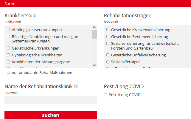 Für alle, die auf der Suche nach einer entsprechenden Reha-Einrichtung sind, bietet das Reha-Einrichtungsverzeichnis der BAR nun ein zusätzliches Merkmal in der Suchmaske. Der Filter kann auch mit anderen Merkmalen wie dem Krankheitsbild oder dem Rehabilitationsträger kombiniert werden. Über 100 Einrichtungen im Reha-Einrichtungsverzeichnis haben bereits angegeben, Rehabilitation bei Post-/Long-COVID durchzuführen.