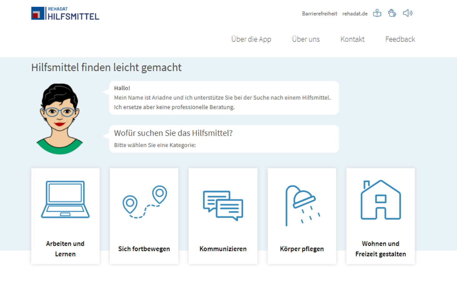 Unter www.hilfsmittelfinder.de stellt REHADAT eine neue geführte Hilfsmittelsuche zur Verfügung. Das Angeot führt Nutzerinnen und Nutzer im Dialog mit der digitalen Suchassistentin Ariadne nach maximal vier Fragen zu Hilfsmitteln für unterschiedliche Aktivitäten. Fünf alltagsnahe Kategorien dienen als Einstieg: Arbeiten und Lernen, Sich fortbewegen, Kommunizieren, Körper pflegen sowie Wohnen und Freizeit gestalten. Mit der neuen Suchstrategie erhalten auch Personen ohne Fachkenntnisse einen schnellen Überblick über Hilfsmittel und einen leichteren Einstieg in die komplexe Hilfsmittelversorgung.