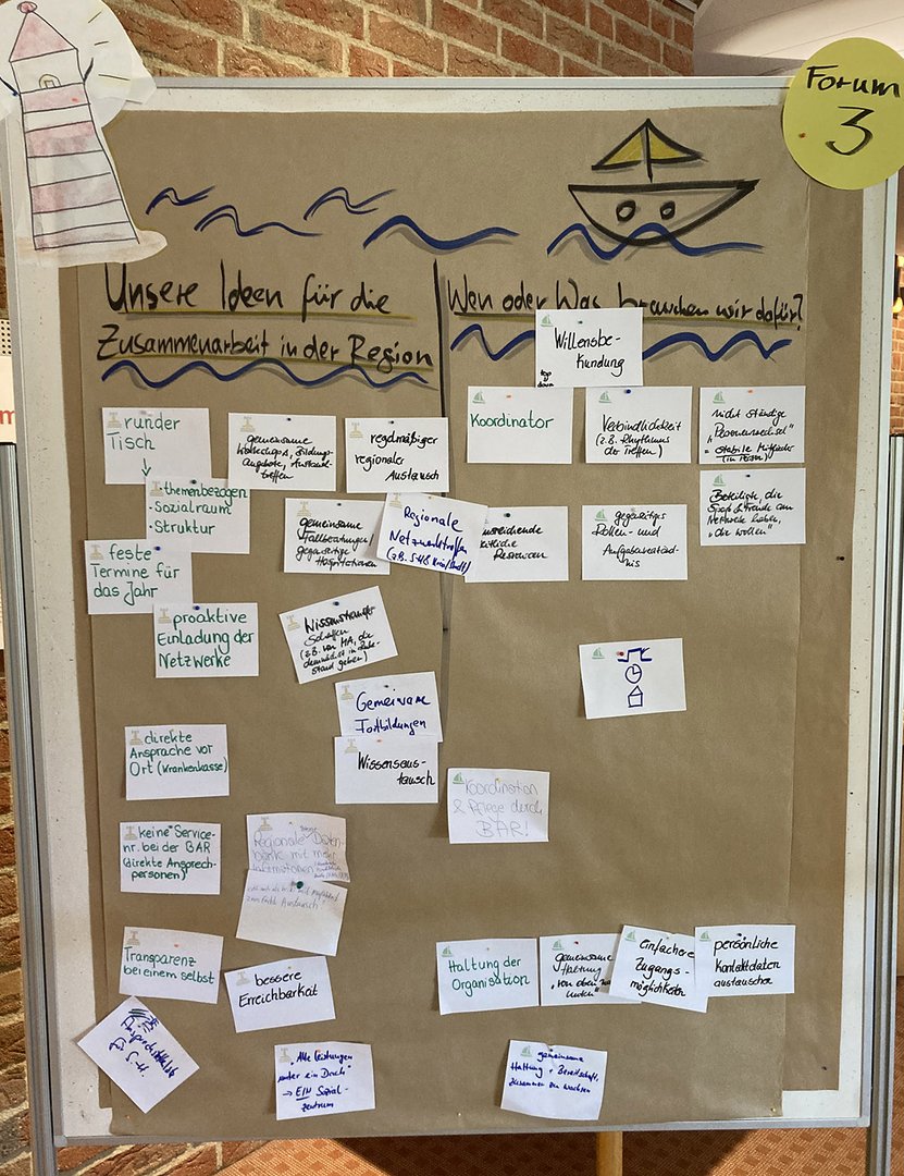 Das Hauptaugenmerk des Tages lag indes auf dem intensiven Austausch der Teilnehmerinnen und Teilnehmer untereinander. In drei Foren stand zunächst das gegenseitige Kennenlernen und ein Brainstorming zur Berufspraxis im Fokus. Gemeinsam sammelte man Anlässe und berufliche Alltagssituationen, bei denen Kontakte helfen, Prozesse zu verbessern. Alsbald wurden in den drei Foren, moderiert von Franziska Fink, Christoph Gerullis-Schmidle und Petra Horn-Bärnreuther (alle BAR), erste Ideen notiert, die den Berufsalltag leichter machen können: Hier nannten die Teilnehmenden u.a. den Wunsch nach regelmäßigen Treffen, bei denen die Institutionen ihre Arbeit, Leistungen und Zuständigkeiten vorstellen. Dadurch solle mehr Transparenz und Verständnis entstehen. Auch wurde die Wichtigkeit von konkret verfügbaren Ansprechpersonen bei allen Trägern sowie die Notwendigkeit herausgearbeitet, dass jemand "den Hut" für die Koordination von nächsten Schritten "aufhaben" müsse.