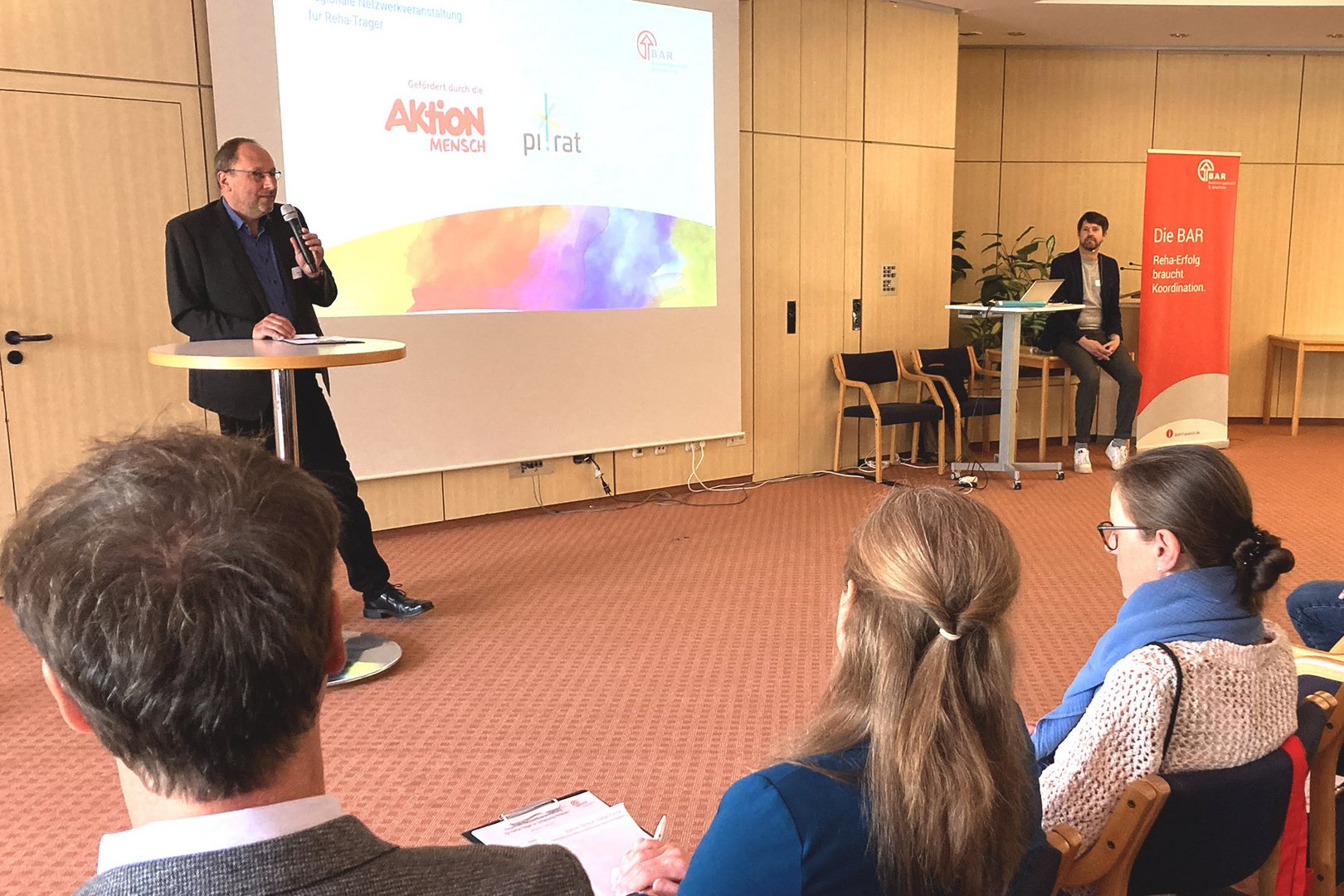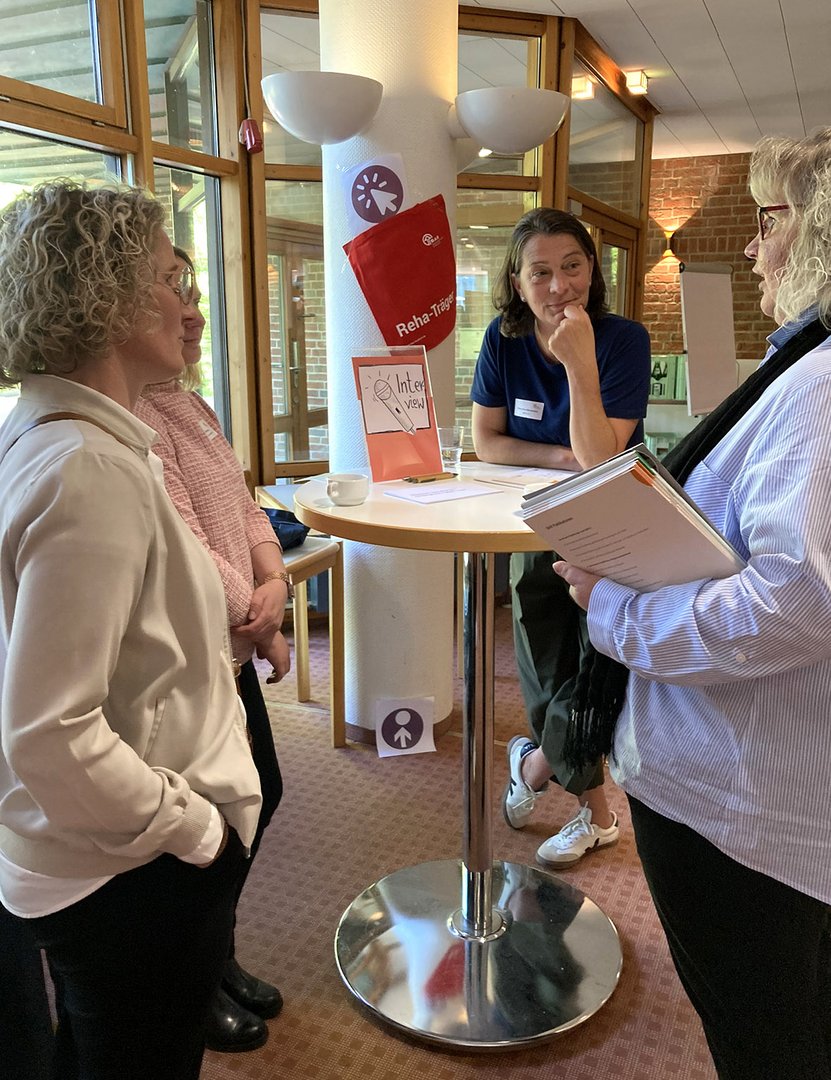Zum programmatischen Auftakt in den Tag stellte Anna-Christina Röttger (Koordinatorin "PI.Rat", AWO Schleswig-Holstein) heraus, wie ein neues Netzwerk-Projekt die Teilhabe im Kreis Pinneberg in den Mittelpunkt stellt. Das Projekt "PI.Rat" hat sich zum Ziel gesetzt, den Sozialraum für alle Menschen gleichberechtigt zu öffnen, ohne Barrieren und egal ob mit oder ohne ohne Behinderung. "PI.Rat" organisiert die Zusammenarbeit von Organisationen, Verbänden, Verwaltung und der Wirtschaft und inkludiert vor allem Expertinnen und Experten im Bereich Teilhabe, die selbst betroffen sind. Bei Netzwerktreffen und Inklusionskonferenzen entstehen neue Synergien für die Lebensbereiche Arbeit und Freizeit. Ein passender Impuls für die Teilnehmenden, dass Zusammenarbeit viele positive Effekte mitbringt. Eine Motivationsspritze schienen die Reha-Praktiker:innen in Kiel an diesem Morgen allerdings nicht zu benötigen, denn sie waren längst in lebhafte Gespräche mit Kolleginnen und Kollegen eingetaucht.