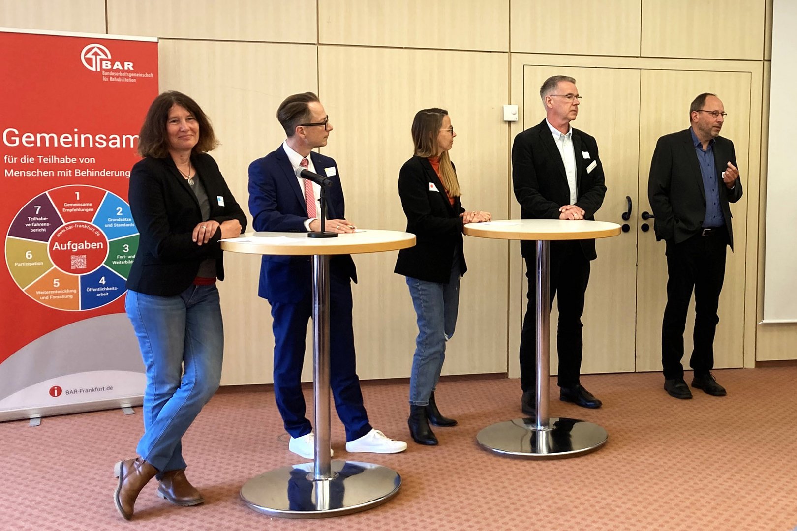 Nachfolgend lud Moderator Eric Meyer zu einer Podiumsrunde. Er begrüßte Beate Keil, Leitung Fachdienst Teilhabe im Kreis Pinneberg (Eingliederungshilfe), Fabian Danger, Teamleiter Reha bei der DRV Nord, Andreas Leschau und Bernd Giraud. Gemeinsam blickte man aus unterschiedlichen Perspektiven auf das Thema Zusammenarbeit. Ebenso ging es um aktuelle Bestrebungen zur Vernetzung aus den unterschiedlichen Trägerbereichen sowie aus der Arbeit der BAR. Ulrike Tofaute, Teilhabeberaterin bei der Lebenshilfe Schleswig-Holstein und fünfte Teilnehmerin der kleinen Talkrunde, brachte die wichtige Perspektive von Antragstellenden bzw. Menschen mit Teilhabebedarf ein. Sie mahnte, dass z.B. unklare Zuständigkeiten nicht zu Lasten der Betroffenen und ihres Rechts auf Teilhabe gehen dürfe.