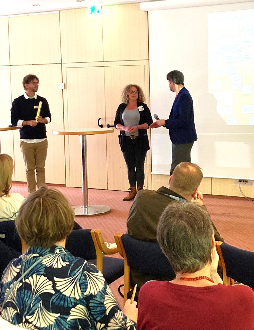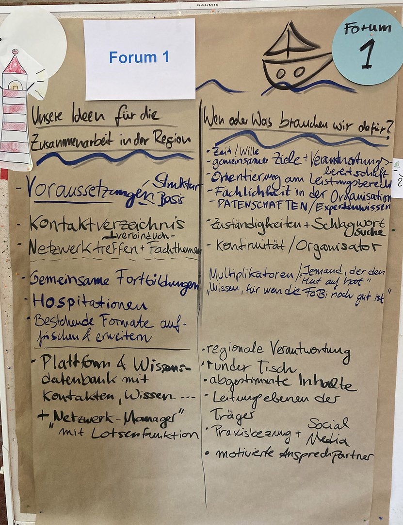 Im Anschluss stellten die Foren ihre Ansätze und Ideen für eine nachhaltige Netzwerk- und Zusammenarbeit im Plenum vor. Eine Arbeitsgruppe traf hier bereits Folge-Verabredungen für die Implementierung eines "Runden Tischs" mit mehreren Trägern. Wichtig war allen Teilnehmenden an diesem Tag aber vor allem das Kennenlernen und das persönliche Gespräch. Natürlich wurden auch viele Visitenkarten getauscht.