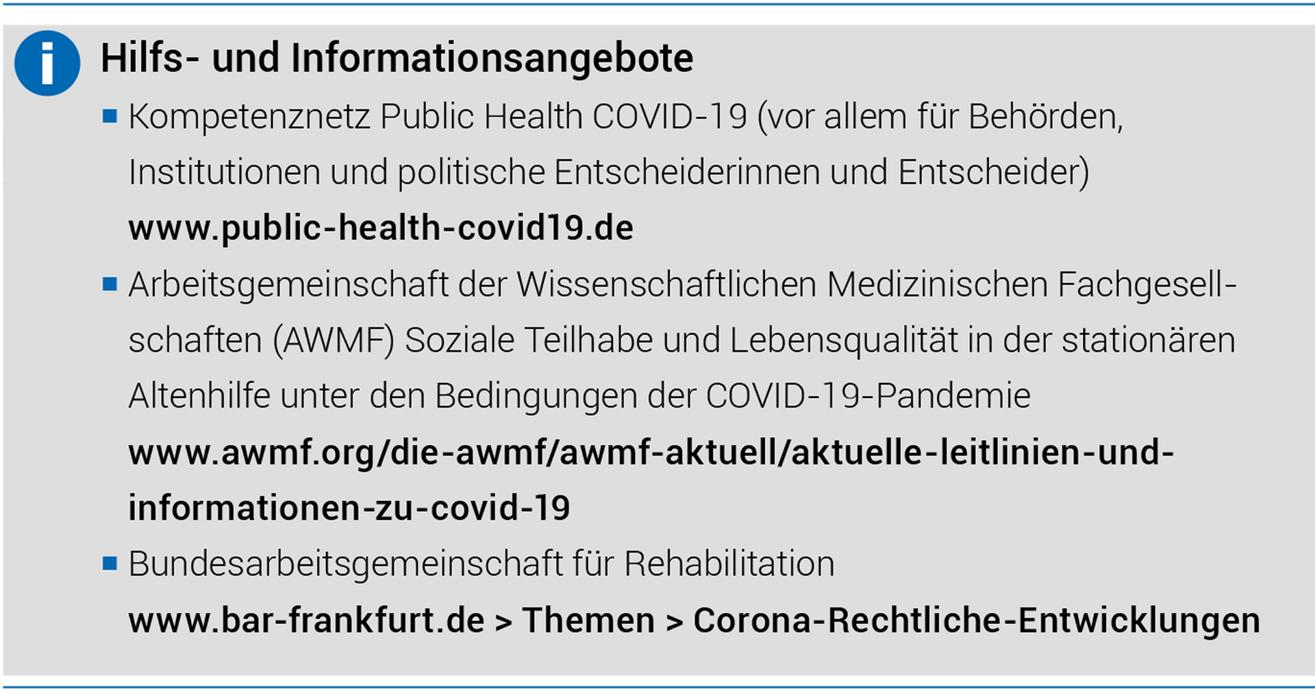 Mittlerweile gibt es aber auch ein ganzes Potpourri an Hilfsangeboten. So haben mehrere Träger und Institutionen Informationsseiten, Blogs, FAQ‘s, Stellungnahmen und Handreichungen zum Thema Reha und Corona veröffentlicht. Es hat sich ein Kompetenznetz Public Health zu COVID-19 gebildet, das verschiedene Handreichungen zur Verfügung stellt, u. a. zum Arbeitsschutz, zu psychischen Arbeitsbelastungen oder zur sozialen Isolation als Mortalitätsrisiko. Die Arbeitsgemeinschaft der Wissenschaftlichen Medizinischen Fachgesellschaften (AWMF) stellt auf ihrem Portal AWMF online Empfehlungen und Leitlinien bereit, u. a. klinisch-ethische Empfehlungen zu Entscheidungen über die Zuteilung intensivmedizinischer Ressourcen im Kontext der COVID-19-Pandemie, Empfehlungen zur intensivmedizinischen Therapie von Patientinnen und Patienten mit COVID-19, Handlungsempfehlungen zur häuslichen Isolierung von Verdachtsfällen und COVID-19-Fällen mit leichtem Krankheitsbild, Patientenleitlinien, Informationen zum Corona-Virus für die hausärztliche Praxis oder Leitlinien zur Therapie von Patientinnen und Patienten mit COVID-19 aus palliativmedizinischer Perspektive. Die BAR berichtet auf ihrer Website über aktuelle Entwicklungen im Bereich Rehabilitation und Teilhabe, die in Zusammenhang mit der Corona-Pandemie stehen.