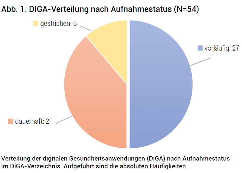 Das DiGA-Verzeichnis umfasst aktuell insgesamt N=54 DiGAs, die vom Bundesinstitut für Arzneimittel und Medizinprodukte (BfArM) als Medizinprodukte gemäß den gesetzlichen Vorgaben (§139e SGB V; DiGAV) geprüft wurden. Entscheidend für die dauerhafte Aufnahme im Verzeichnis ist der formelle Wirksamkeitsnachweis innerhalb eines Jahres während der Erprobungsphase. In Abbildung 1 wird ersichtlich, dass mit N=27 der überwiegende Anteil der Anwendungen vorläufig aufgenommen ist. 21 dauerhaft aufgenommene Anwendungen stehen 6 Anwendungen gegenüber, die aus dem DiGA-Verzeichnis gestrichen wurden, weil sie sich in der Versorgung von Patientinnen und Patienten nicht bewährt haben.
