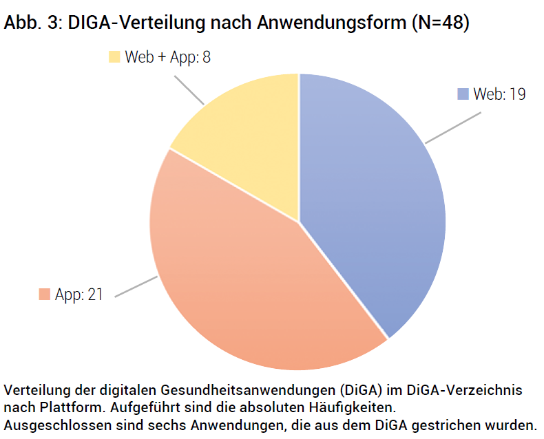 Wie Auswertungen zur Anwendungsform der DiGAs in Abbildung 3 verdeutlichen, stehen diese gleichermaßen als browserbasierte Anwendungen und Apps (Apple iOS, Google Android) zur Verfügung.