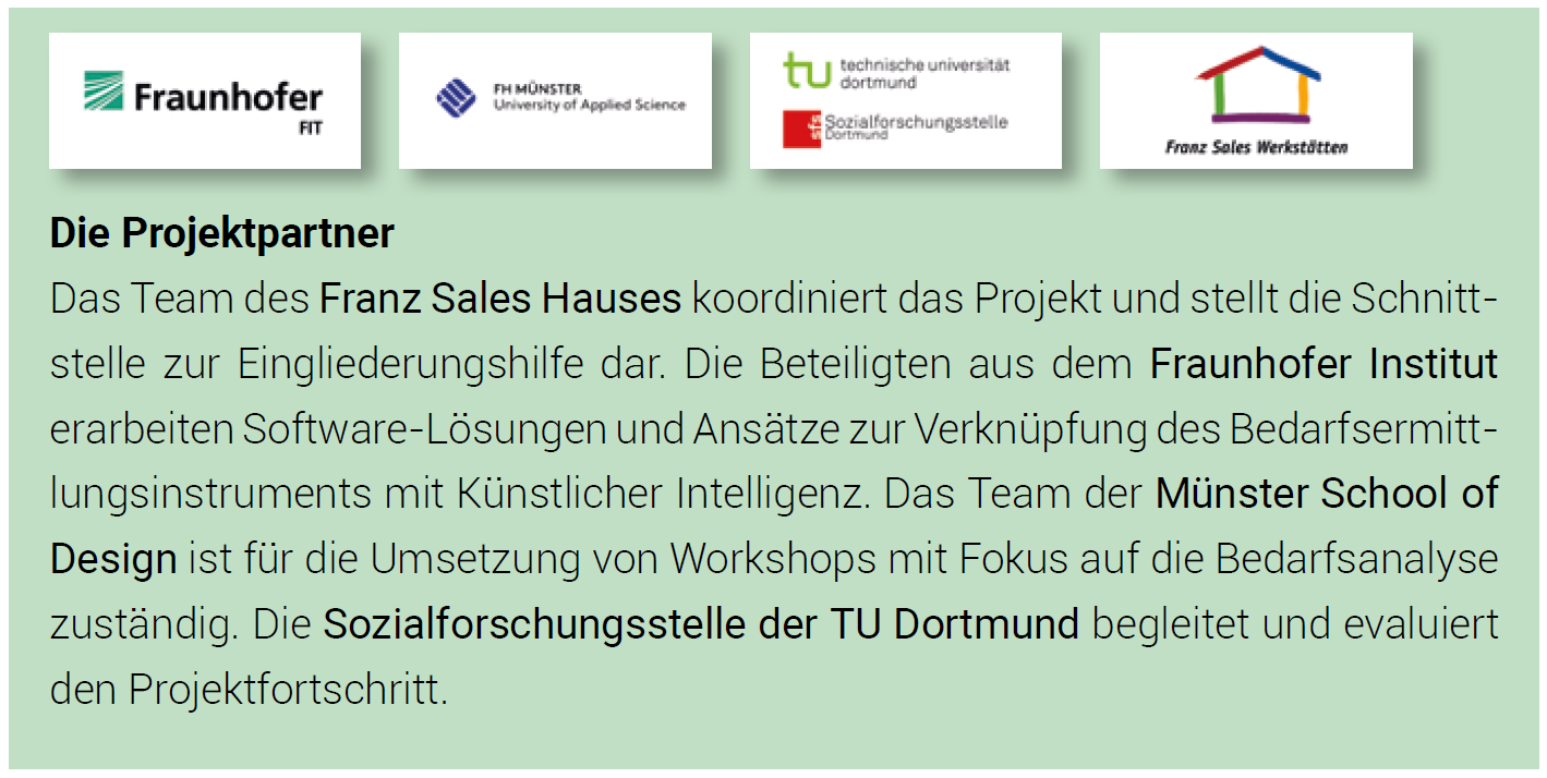 Das vom Bundesministerium für Arbeit und Soziales geförderte Projekt ist Ende 2021 gestartet und läuft über fünf Jahre. Das interdisziplinäre Projektteam will Menschen mit Behinderung dazu befähigen, einen Beruf zu finden, der ihren Wünschen und Kompetenzen entspricht. Dafür sind Menschen mit Behinderung von Beginn an als Expertinnen und Experten in eigener Sache einbezogen. In partizipativen Workshops wirken sie daran mit, ein marktreifes Tool zu entwickeln, das bundesweit zur Verfügung stehen soll. Sie helfen außerdem, Barrierefreiheit mitzudenken, sodass Arbeitsplätze bedarfsgerecht und individuell gestaltet werden können.