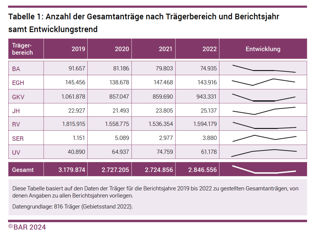 Wie man aus Tabelle 1 entnehmen kann, steigt die Anzahl der Anträge nach dem Einbruch 2020 weiterhin an, hat aber noch nicht das Vor-Corona-Niveau erreicht mit Ausnahme der Jugendhilfe und Unfallversicherung, die eine andere Entwicklung genommen haben und jetzt mehr Anträge als vor Corona aufweisen.