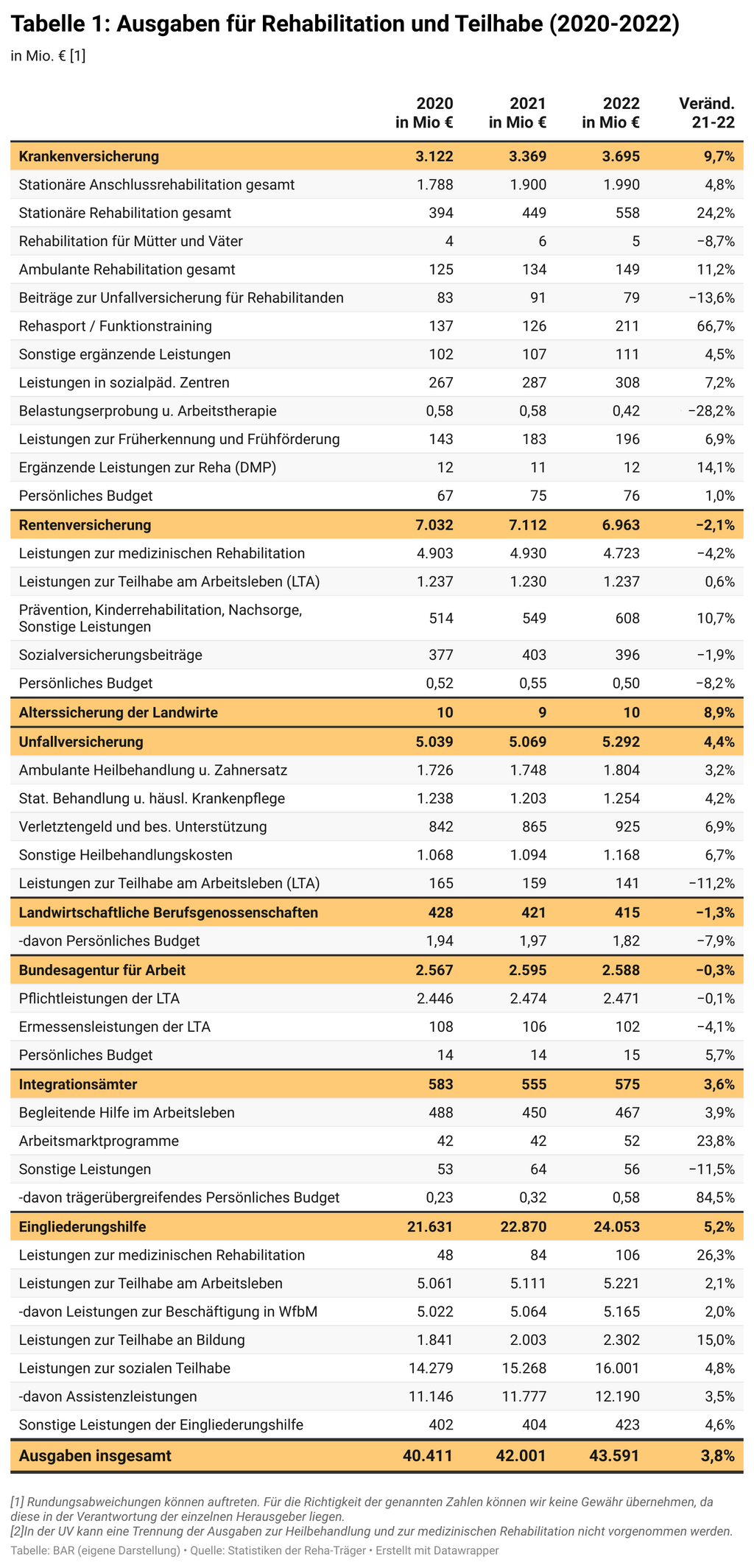 Die Tabelle 1 stellt die trägerübergreifende Statistik zu den Ausgaben für Reha und Teilhabe dar.
