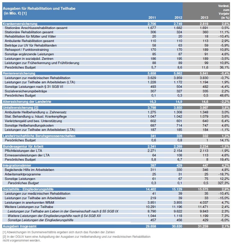 Die Sozialhilfeträger erbrachten im Rahmen der Eingliederungshilfe 2013 nach der Sozialhilfestatistik des Statistischen Bundesamtes Leistungen in Höhe von 15,6 Mrd. €, was 50 % aller Ausgaben für Rehabilitation und Teilhabe entspricht.