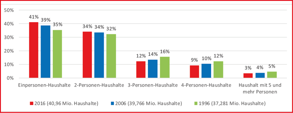 Das klassische Familienmodell befindet sich also im Rückzug. Aber wie leben die Menschen heutzutage in Deutschland? 1996 waren nur 35,4 % der Haushalte Einpersonenhaushalte. Inzwischen sind es 41,1 %. Die Zahl der Haushalte mit 5 oder mehr Personen ist dagegen von 4,6 % auf 3,4 % zurückgegangen. Zusammenfassend ist aus den Zahlen des statistischen Bundesamtes ein Trend zu kleineren Haushalten deutlich zu erkennen (vgl. Abb. 1).