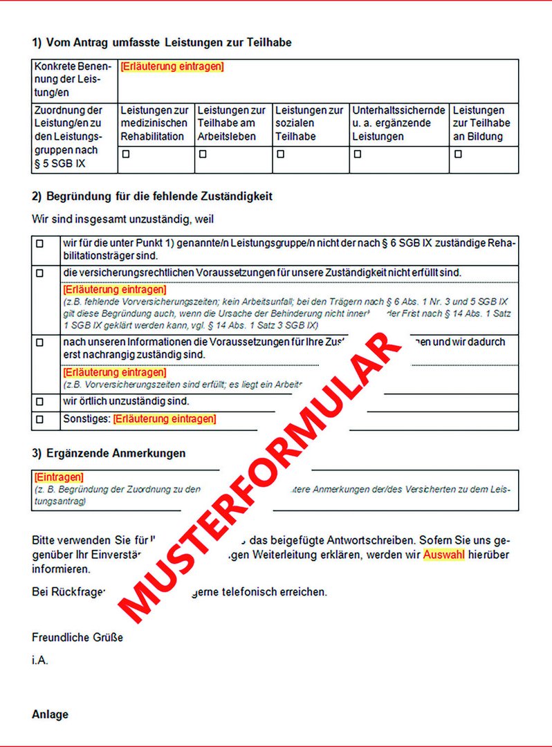 Damit solche Verwaltungsprozesse gerade im „Massengeschäft“ schneller und einfacher funktionieren, wurden bei der BAR Musterformulare entwickelt, die nahtlos an die Neuregelungen des SGB IX und der GE Reha-Prozess anschließen. Sie sind als Word-Vorlagen und zusammen mit Erläuterungen unter: www.bar-frankfurt.de > Reha-Prozess > Musterformulare abrufbar.